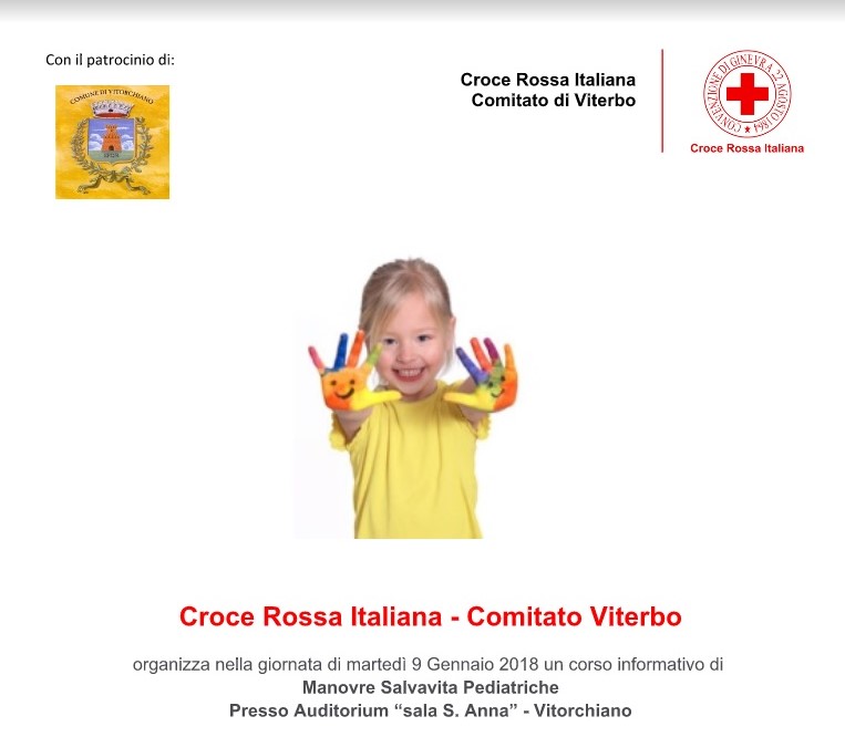 La Croce Rossa di Viterbo organizza un Corso teorico/pratico il 09 Gennaio della durata di circa 4 ore (dalle 15:30 alle 18:30) sulle manovre salvavita pediatriche presso Presso Auditorium “sala S. Anna” - Vitorchiano.